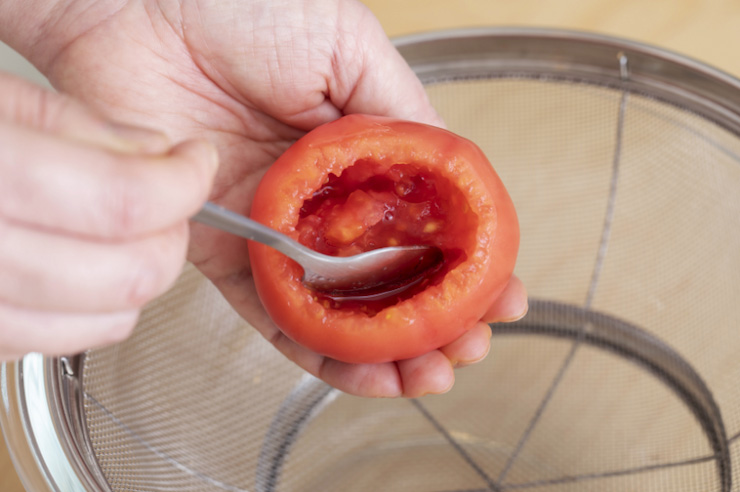 スプーンでくり抜く際には、トマトのおしりの部分を手で包むように持つのがコツです。トマトがつぶれず、穴を開けないようにくり抜くことができます。