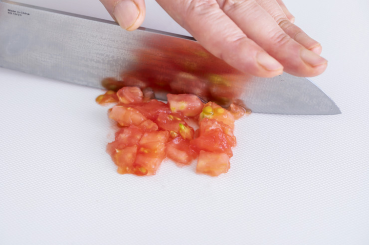 くり抜いたトマトの中身をざるでこして水分をきり、ざるに残ったトマトの中身をまな板の上に置き、1.5cm角に切る。