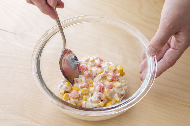 5コーンとトマトをドレッシングで和える