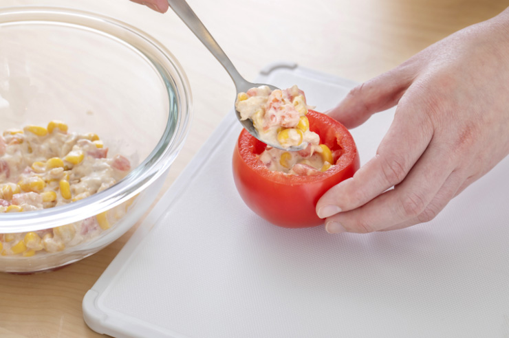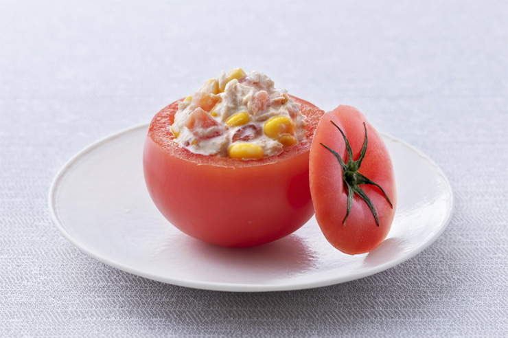 ファルシーとは、トマトやピーマンなどの野菜の中身をくり抜いて器にし、その中に具材を詰める料理のことで、見た目も楽しいサラダです。トマトのジューシー感・うま味と、コーンの甘味・食感が合わさり、相乗効果でおいしいサラダになります。