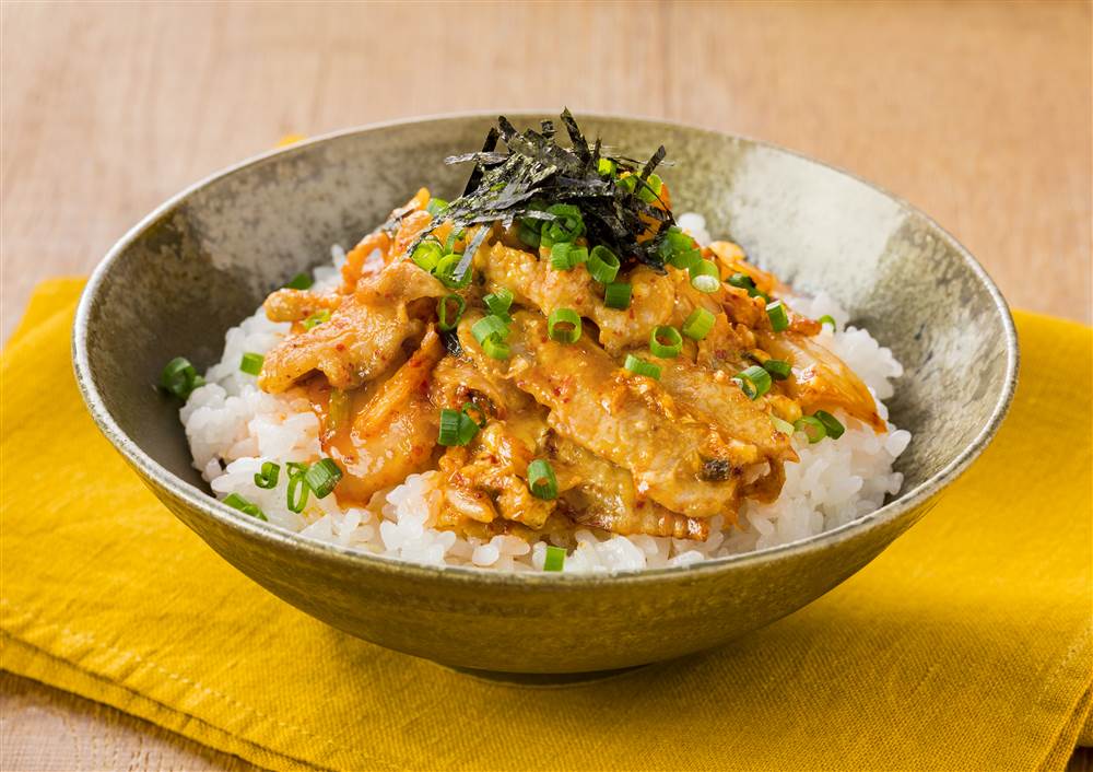 キムチと相性抜群の豚肉をマヨネーズで炒めて、ご飯にのせました。キムチのピリッとした辛みにマヨネーズのコクが加わり、豚肉のおいしさを引き出します。ご飯がすすむ一品です。